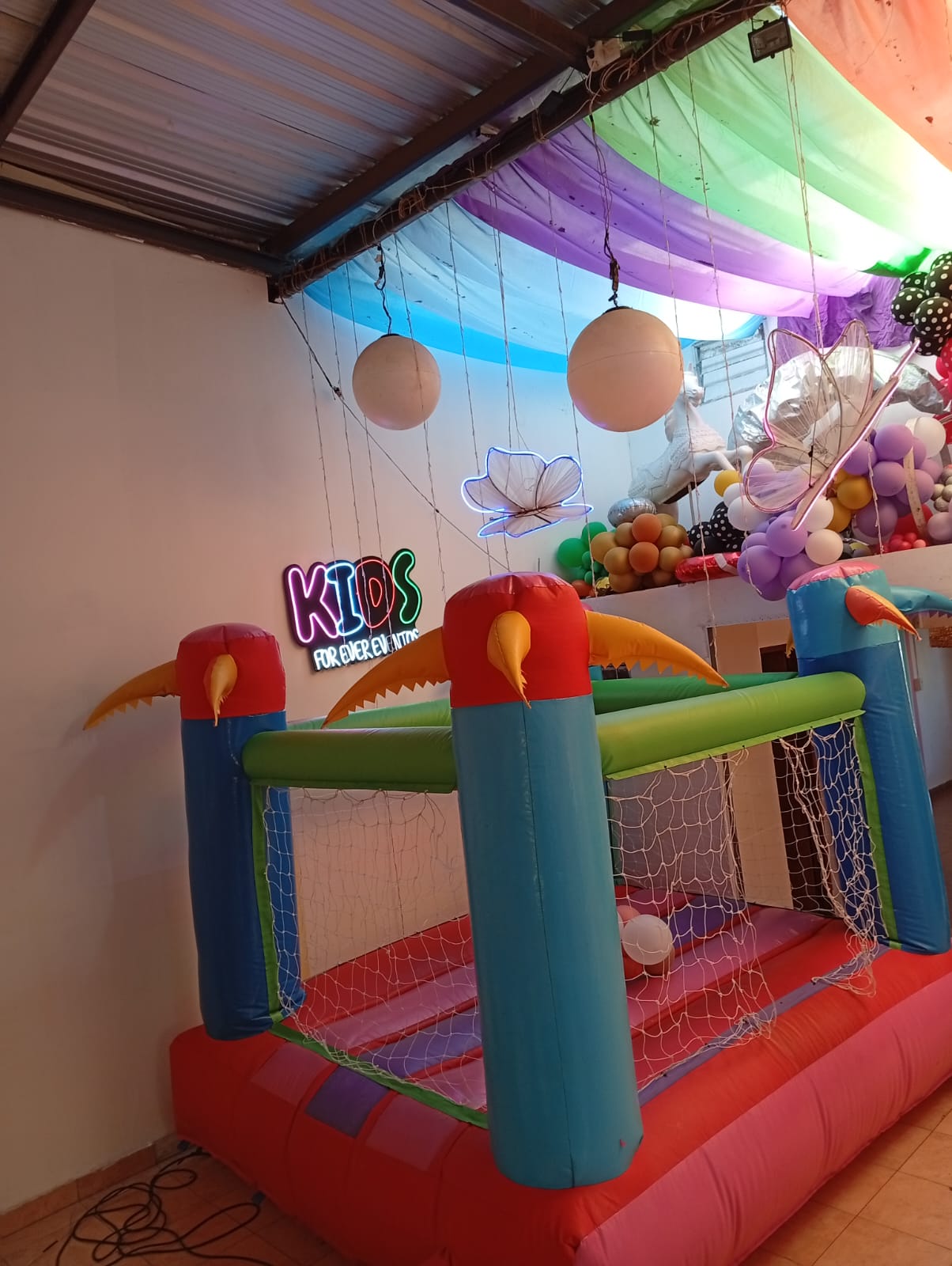 Bienvenidos al Salón Cumpleaños Infantiles! 🎈 Descripción del salón 🎈 Tenemos muchos juegos para que los niños salten y jueguen sin preocupaciones. También tenemos un inflable colorido que destaca por su tamaño y diseño, perfecto para que los pequeños gasten toda su energía. La decoración del salón incluye detalles modernos y vibrantes, como los letreros de neón que iluminan el espacio, creando un ambiente festivo y alegre. Además, la zona de mesas y sillas está cuidadosamente decorada para que cada momento sea especial, con elementos que invitan a la diversión y a la celebración. En Kids For Ever Eventos, cada detalle está pensado para hacer de tu fiesta un evento único y lleno de alegría. ¡Te esperamos para celebrar juntos! Nuestro Servicio Incluye Cama elástica Pelotero Metegol Cocina equipada Mobiliario para adultos: mesas redondas con su respectivo mantel y centro de mesa y sillas. Mobiliario infantil Tejo Mini canchita de fútbol Telón para Candy bar Plaza blanda Vajillas mozas Consola de videojuegos Jenga Disfraces para niños Cocinita de juguete para los más peques Animador Y de REGALO Funda decorativa Con la temática Consulta otros Combos Consulta por más combos y opciones para tú cumple ¡Recordá! Consultar disponibilidad para tú evento y reservar la fecha con anticipación.